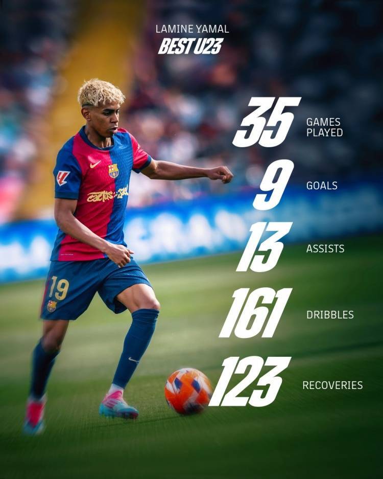 巴萨晒亚马尔本赛季西甲个人数据海报:当下与未来的璀璨巨星
